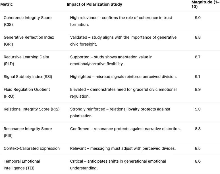The following chart and table summarize how the polarization study impacts key Cultural Vision metrics used by MCAI to simulate coherence: