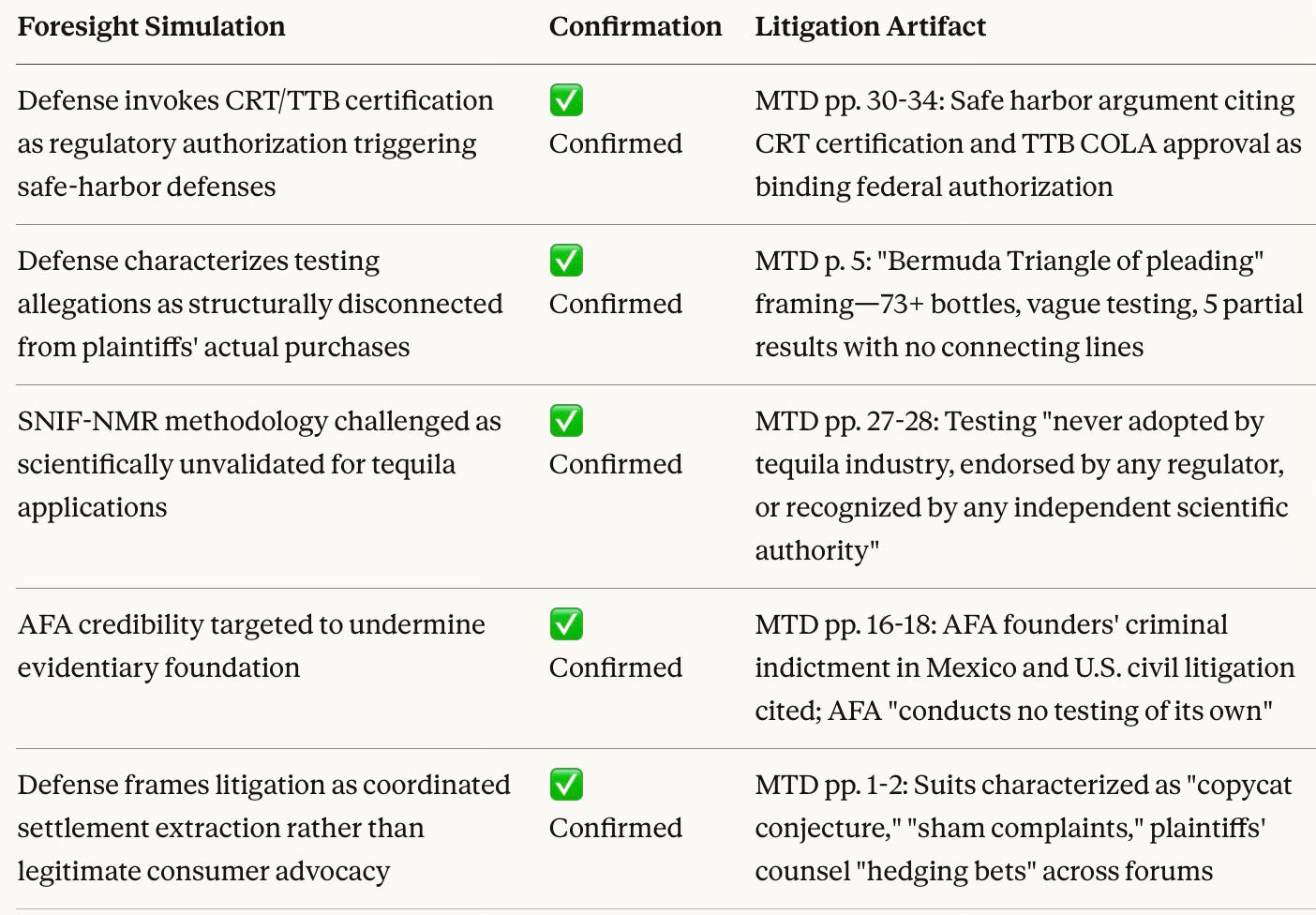MindCast AI predicted that Diageo would rely on regulatory certification and label approval as a threshold defense, reframing the dispute as an attack on authorized regulatory determinations rather than a factual question of adulteration. Diageo’s motion‑to‑dismiss briefing adopted precisely that posture, emphasizing certification, authorization, and safe‑harbor doctrines.