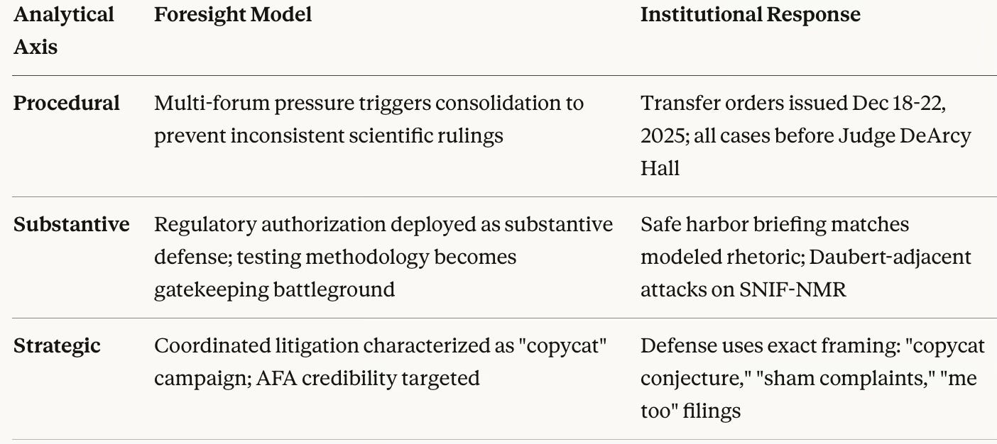 Across three independent publications, MindCast AI modeled how courts and defendants respond when science-based allegations collide with regulatory certification and multi-forum pressure. The validation is not that any single argument prevailed, but that the same institutional dynamics emerged repeatedly: consolidation over fragmentation, regulatory authorization as a threshold defense, and methodological gatekeeping as a substitute for merits discovery.