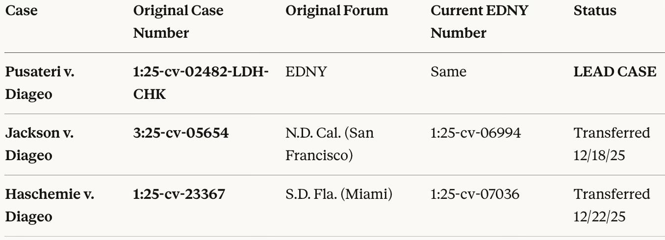 The Diageo litigation remains pending before Judge DeArcy Hall. Discovery has not commenced. No merits ruling has issued. The factual question—whether Casamigos and Don Julio contain non-agave alcohol—remains unadjudicated.