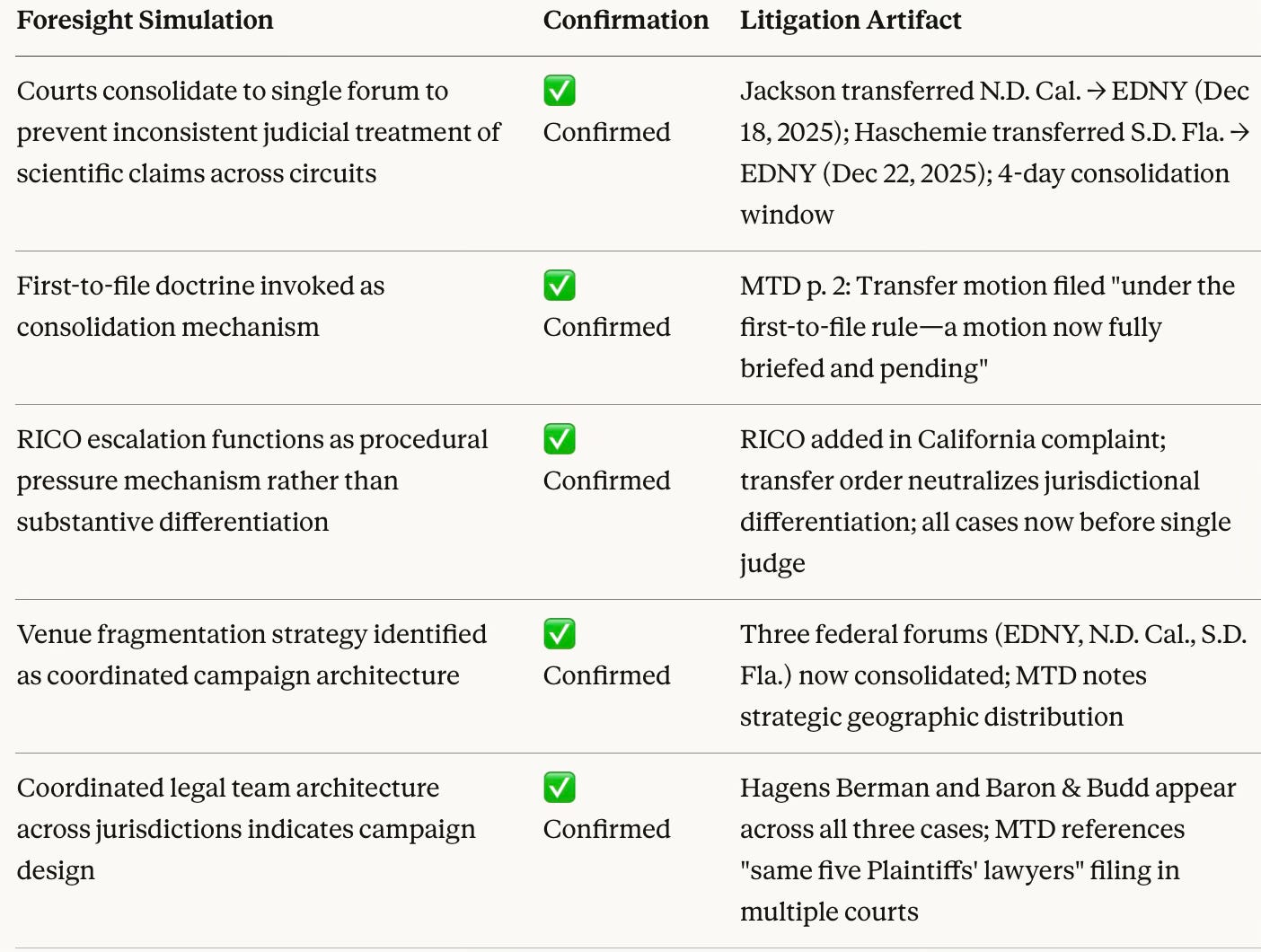 This analysis predicted that courts would resist venue fragmentation by applying the first‑to‑file rule, consolidating the cases into a single forum to avoid inconsistent treatment of the same scientific allegations. It further predicted that RICO escalation would be neutralized procedurally rather than litigated on the merits.