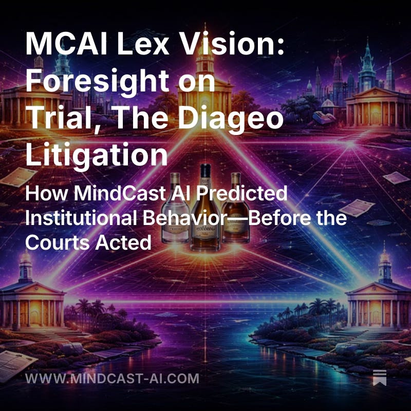 The Diageo litigation provides a rare, clean validation set for MindCast AI’s foresight methodology. Key predictions were confirmed not by final judgments, but by observable institutional behavior.