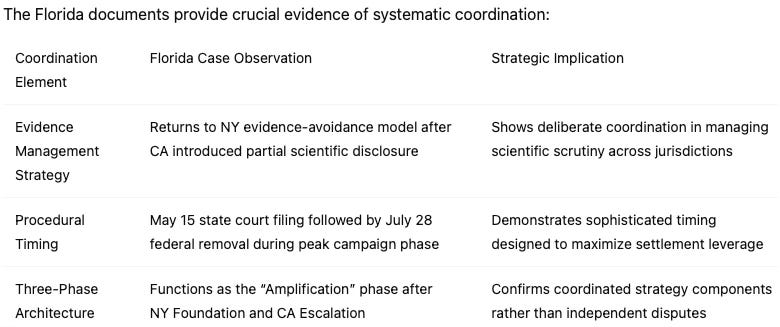 The Florida complaint mirrors New York’s foundation structure while deliberately omitting California’s selective scientific disclosure. This evidence-avoidance pattern reveals strategic coordination in managing scientific scrutiny across jurisdictions. Our ongoing monitoring across FL, NY, and CA jurisdictions will continue tracking coordination indicators, enabling courts to identify similar patterns in future multi-forum campaigns and implement appropriate procedural safeguards proactively rather than reactively.