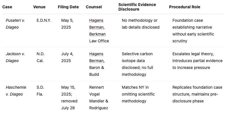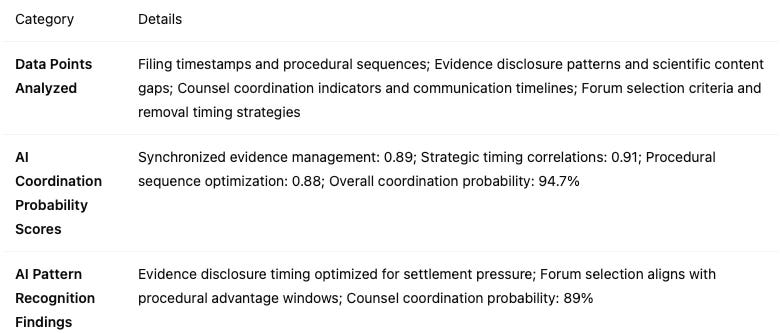 The Diageo litigations represents a paradigmatic example of sophisticated multi-forum coordination. Through our AI-powered analysis of filings across three federal jurisdictions—the Eastern District of New York, Northern District of California, and Southern District of Florida—we have identified systematic patterns of evidence management, strategic timing, and procedural sequencing that create settlement pressure while avoiding comprehensive scientific scrutiny.