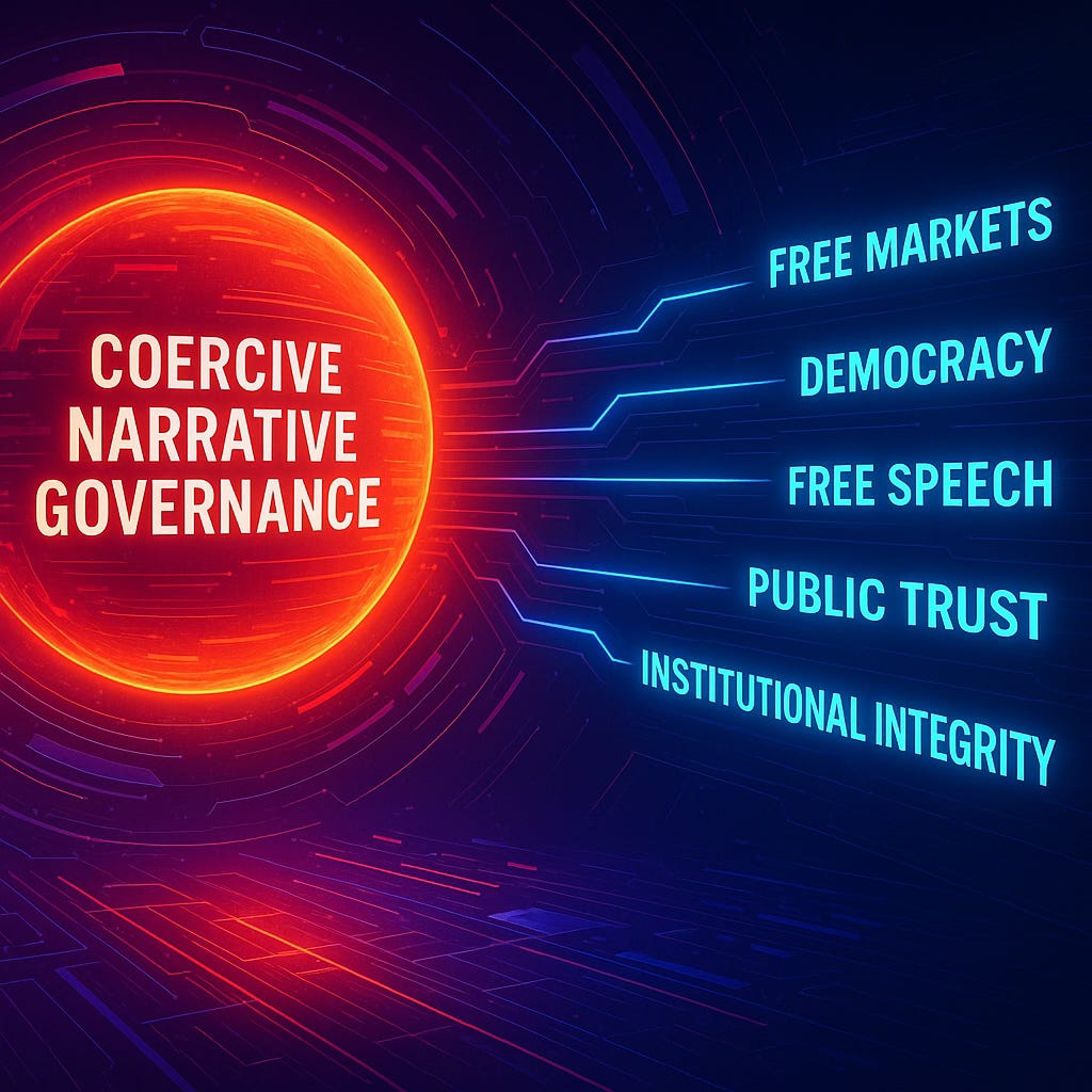 Free markets and liberal democracies rely on a foundation of public trust. Institutions function efficiently when participants believe rules are applied fairly, information flows transparently, and choices are respected. But a rising pattern of coercive narrative governance—where power is exercised through story manipulation, media capture, and fear-based signaling—now challenges the foundations of both markets and democracy.