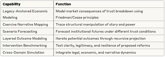The model uses Friedman and Coase as legacy-anchored simulated behavior models to simulate how breakdowns in trust ripple through contract enforcement, innovation pipelines, and global capital flows. It allows us to see not only the theoretical importance of trust, but the likely consequences when that trust degrades.