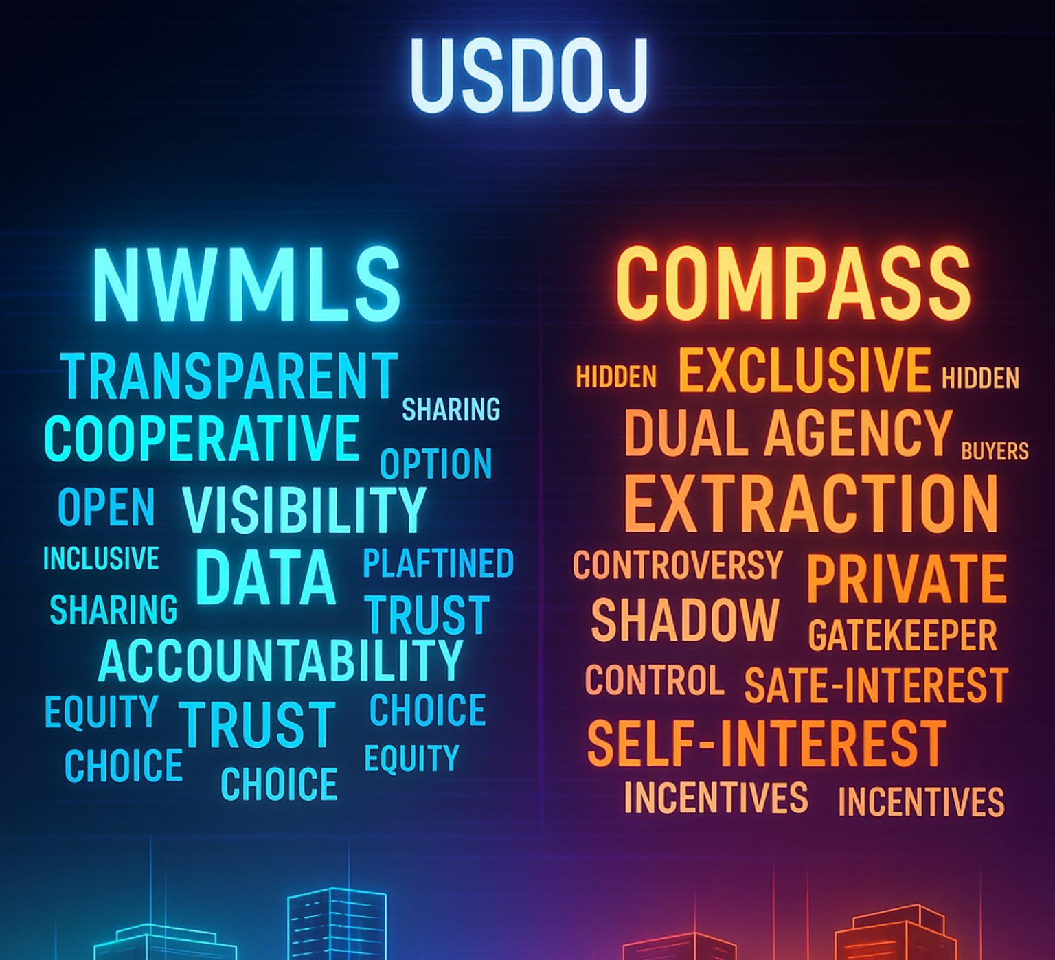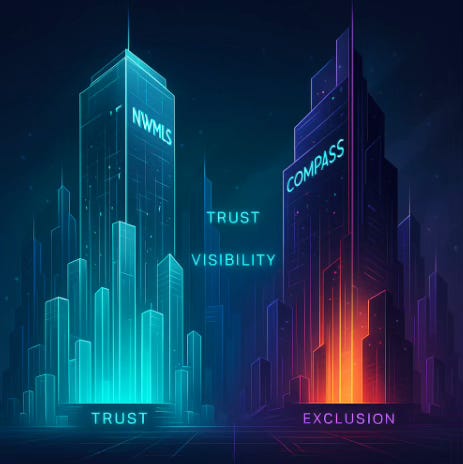 🏛️ Visual Architecture: Imagine a futuristic, translucent urban skyline—not made of buildings, but of data towers. Each tower represents a node of trust, visibility, or exclusion. NWMLS stands as a shimmering, open-source tower pulsing with real-time data and cooperative access. Next to it, Compass looms like a dark mirror skyscraper: elegant, branded, but partially opaque, its interior lit by flickers of exclusivity, dual-agency incentive schemes, and shadow listings only visible to insiders.