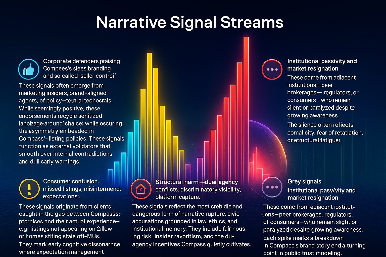 This is not market evolution—it’s infrastructural enclosure. And this report visualizes Compass’s reputational collapse using MCAI’s foresight engine, narrative signal analysis, and architectural insight.** The collision between real estate platform centralization and civic transparency norms. Compass isn’t simply violating those norms—it’s actively rewriting them in its favor.