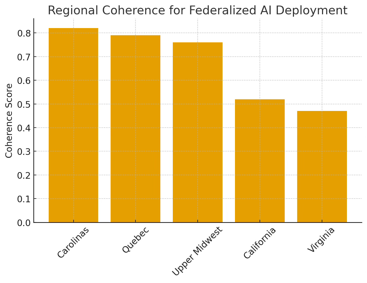 MindCast AI institutional coherence analysis: High‑coherence regions—the Carolinas, Quebec, and the Upper Midwest—are positioned to integrate federal standards quickly, while fragmented regions such as the Pacific Northwest, California, and PJM East struggle to adapt. Institutional coherence measures how well regulatory frameworks, utility incentives, and political structures align to execute policy shifts. High coherence accelerates deployment; low coherence creates friction.