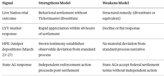 Antitrust: Live Nation stock movement, reported unusual options activity around the HPE-Juniper settlement announcement, and Semafor’s characterization of the post-Slater environment constitute shadow pricing of enforcement outcomes