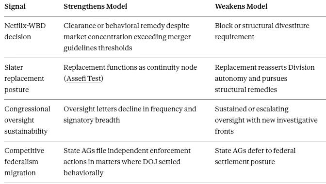 Observable proxies: gap between stated enforcement theory and settlement/disclosure terms; sequential compounding across multiple matters (reported behavioral normalization in HPE-Juniper → Compass clearance → Live Nation settlement posture compounds CDR faster than any single matter); market pricing of enforcement expectations (LYV post-Slater rally prices CDR in real time)