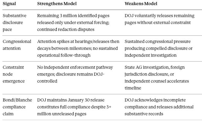 Falsifiable claim: if an independent constraint node emerges in the Epstein context (state AG investigation into related state-law violations, foreign jurisdiction disclosure, independent counsel appointment), the model predicts acceleration of substantive disclosure within 90 days