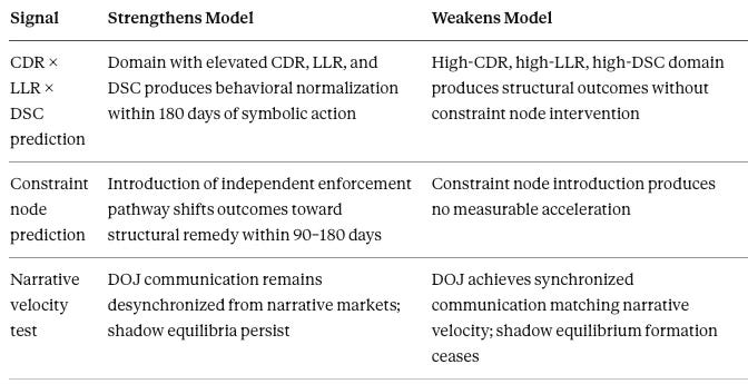 Prediction: any federal enforcement or disclosure domain where CDR, LLR, and DSC simultaneously exceed threshold values will produce behavioral normalization within 180 days of initial symbolic action, absent independent constraint nodes