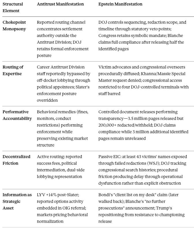 Five independent structural parallels emerged from MindCast CDT analysis across the Epstein and antitrust suites without being designed to converge. Each operates through different statutory mechanisms but produces functionally identical outcomes.