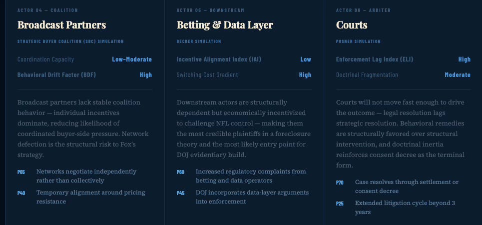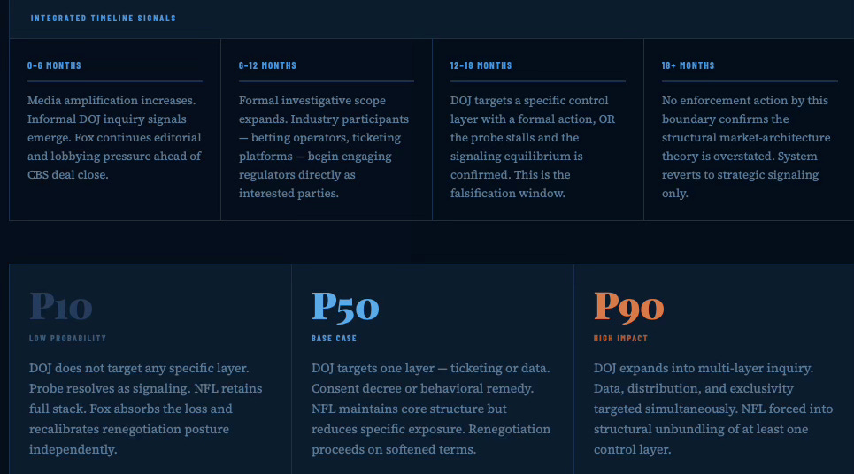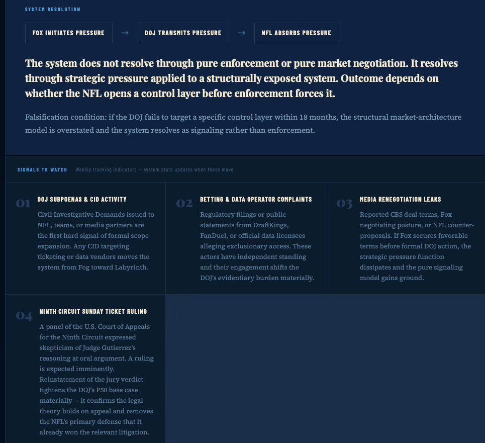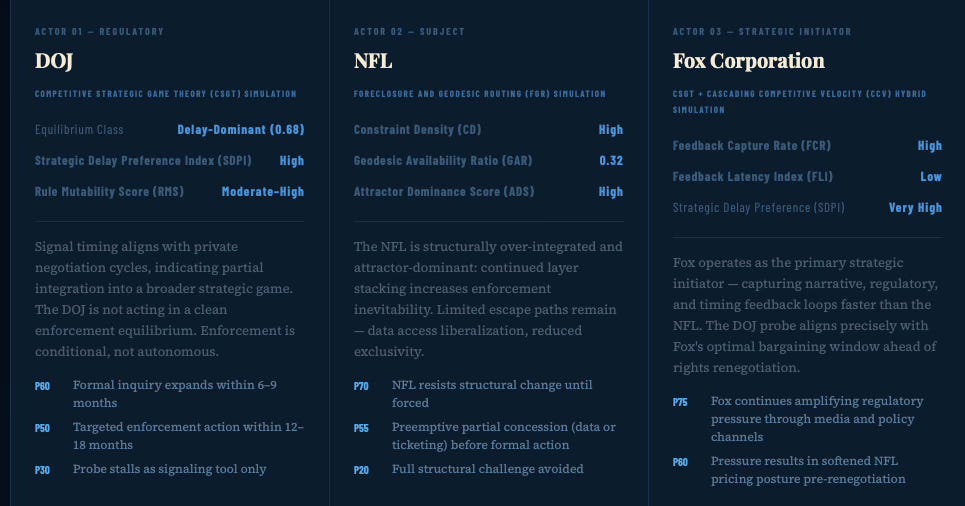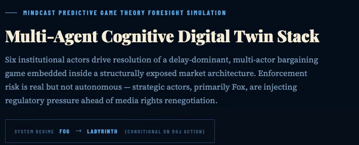 The Dual Nash-Stigler Equilibrium Architecture, MindCast AI, January 21, 2026. Documents the two Nobel Prize-grounded runtime constraints governing all MindCast simulations: Nash equilibrium as the behavioral settlement termination condition — determining when the DOJ-NFL-Fox conflict resolves because no actor can improve by continuing to fight — and Stigler equilibrium as the inquiry sufficiency governor, determining when the DOJ stops building its evidentiary case. The P50 base case prediction in this publication (targeted enforcement, consent decree) reflects a Nash-governed settlement basin; the 18-month falsification boundary reflects a Stigler-governed information sufficiency cutoff.