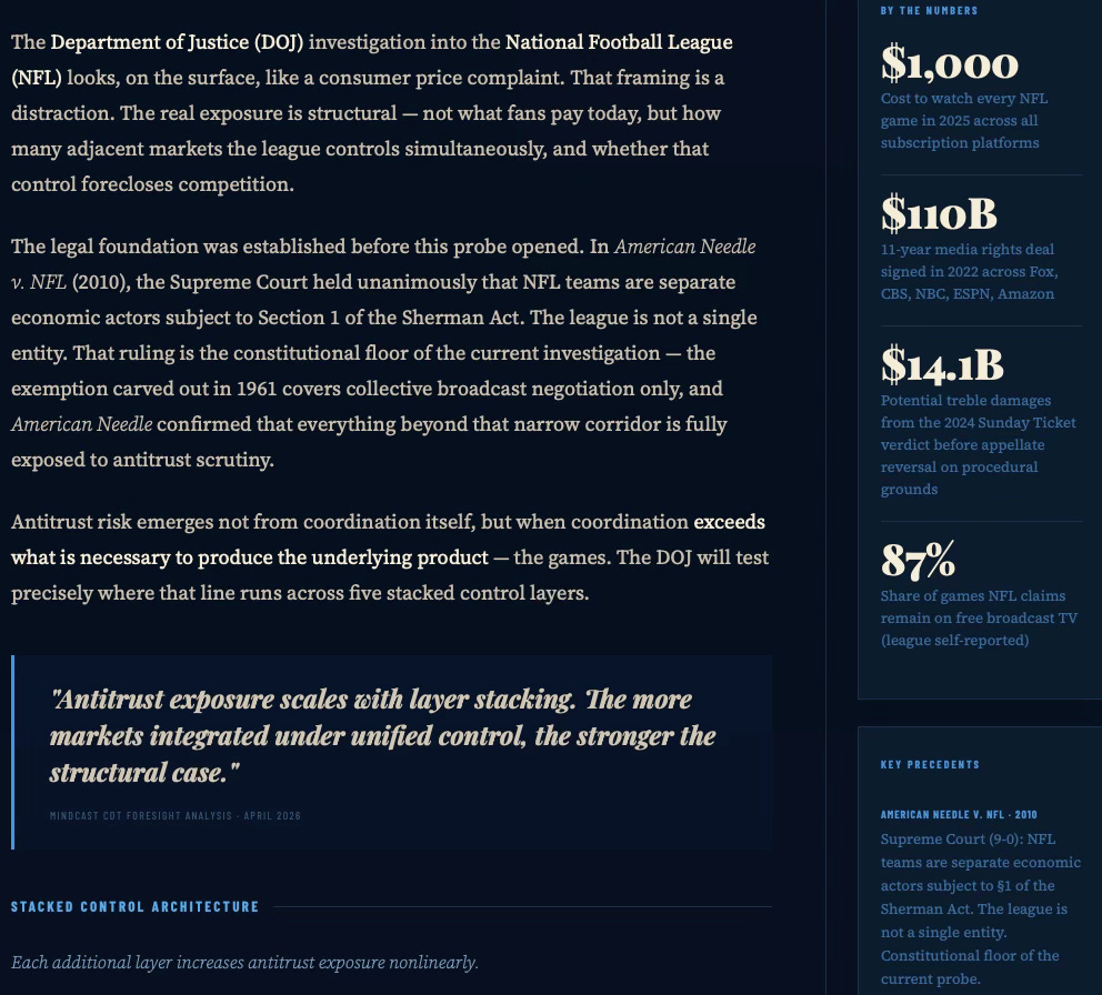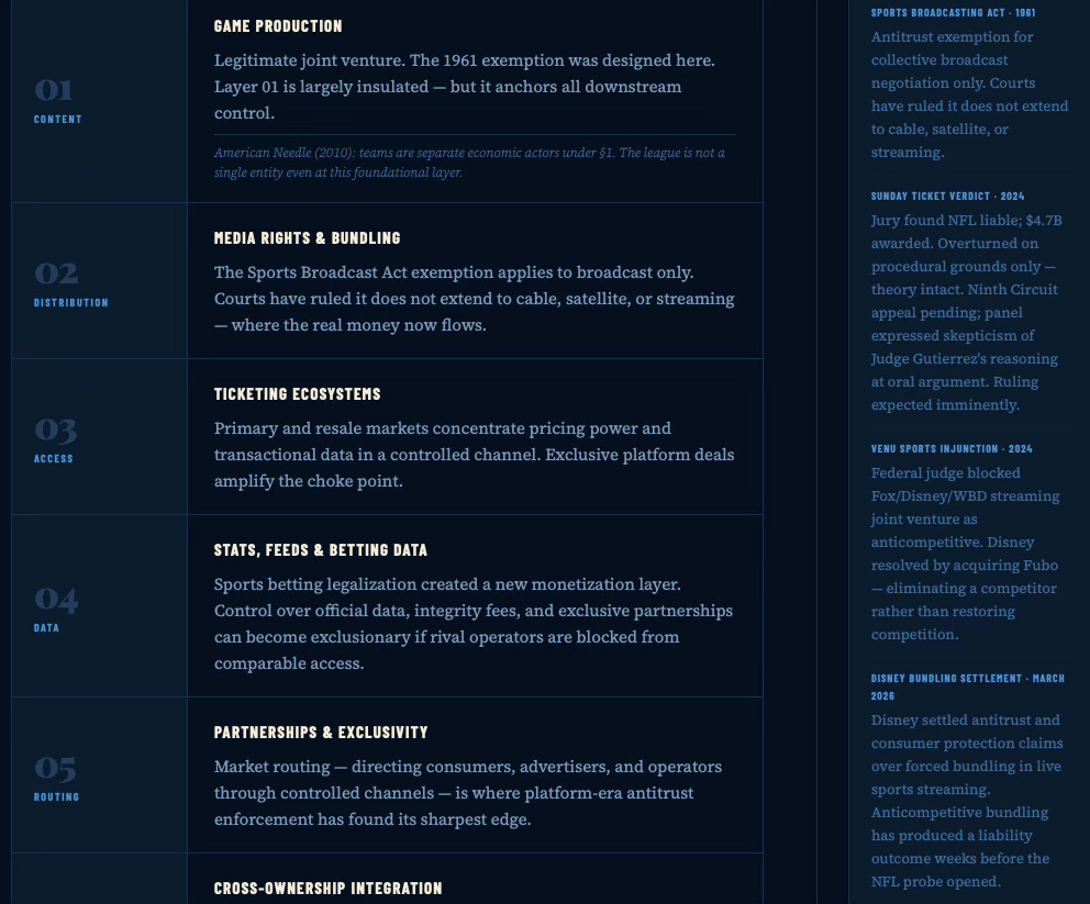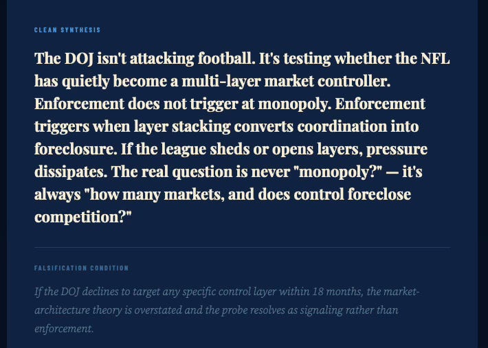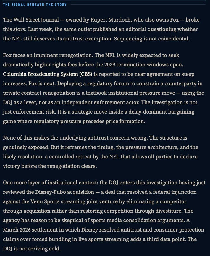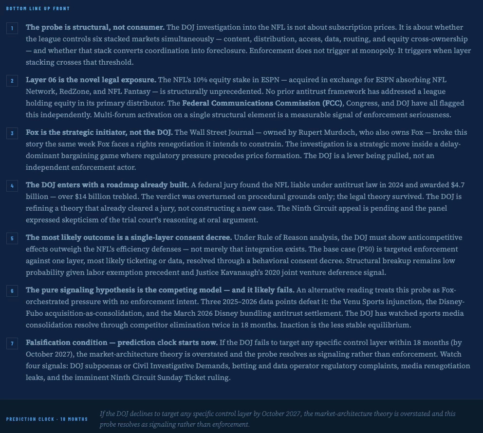 The DOJ probe is less about price-fixing and more about the NFL’s emergence as a platform monopoly across six downstream industries — media, ticketing, data, betting, streaming, and labor-adjacent IP. Enforcement does not trigger at monopoly. It triggers when layer stacking converts coordination into foreclosure. The strategic initiator here is not the DOJ: it is Fox, injecting regulatory pressure ahead of a rights renegotiation it intends to win.