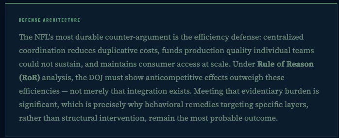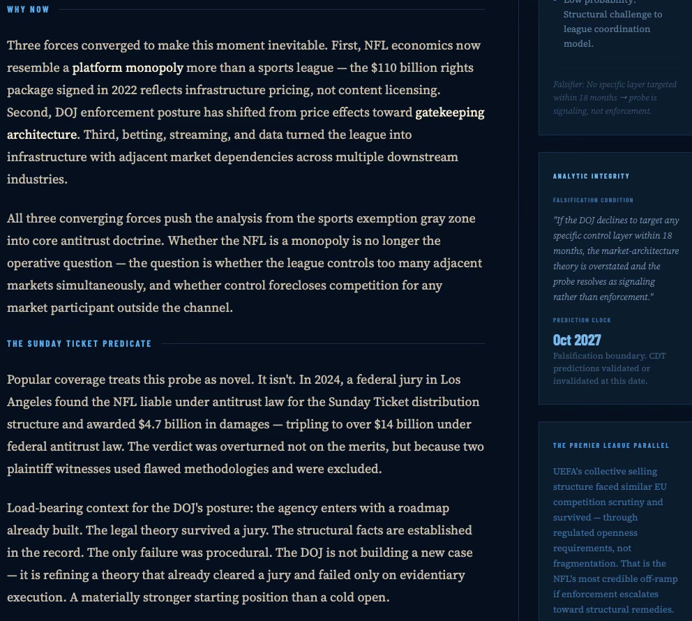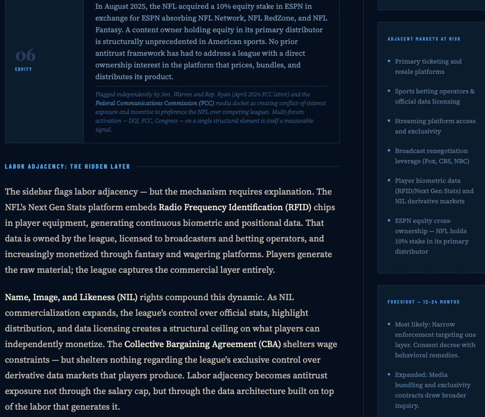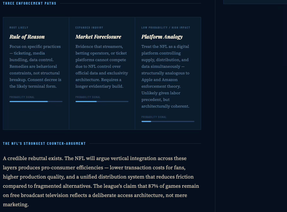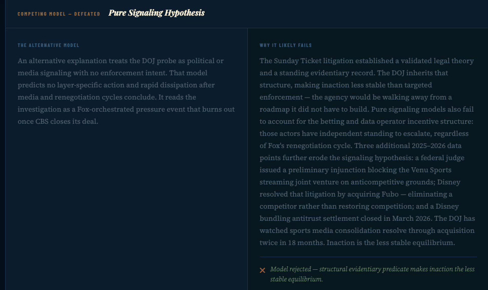 The DOJ probe is less about price-fixing and more about the NFL’s emergence as a platform monopoly across six downstream industries — media, ticketing, data, betting, streaming, and labor-adjacent IP. Enforcement does not trigger at monopoly. It triggers when layer stacking converts coordination into foreclosure. The strategic initiator here is not the DOJ: it is Fox, injecting regulatory pressure ahead of a rights renegotiation it intends to win.