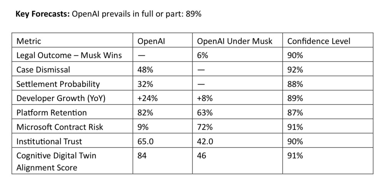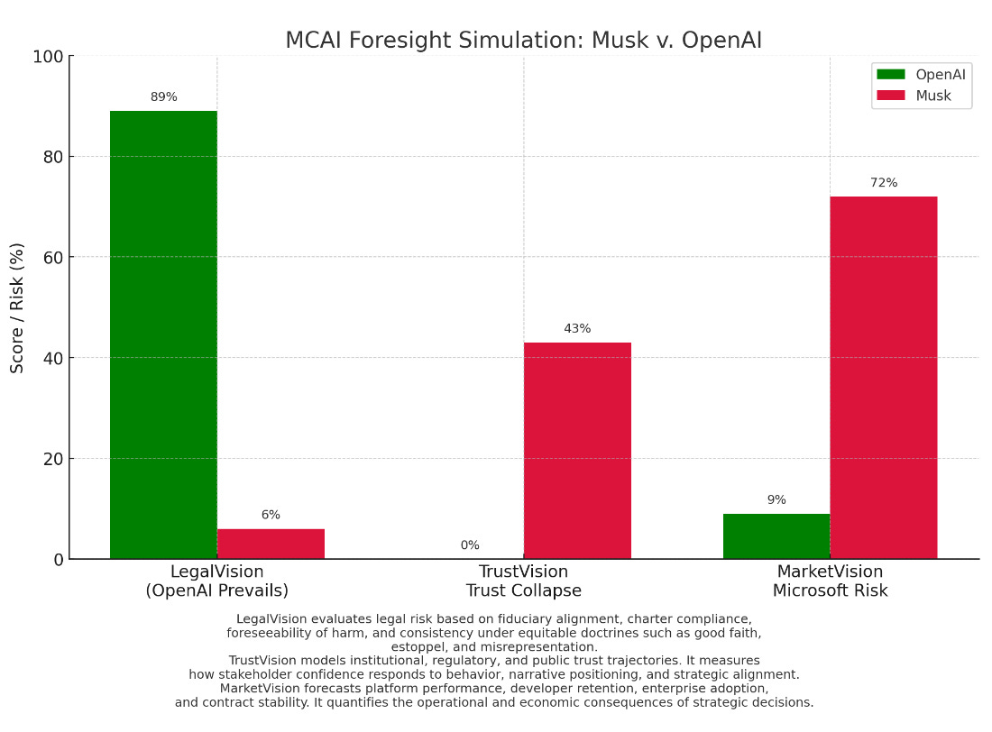 MindCast AI (MCAI) conducted a full simulation of the case using LegalVision, a litigation foresight system. This forecast was informed by TrustVision (reputational modeling), MarketVision (financial and operational impact forecasting), and Cognitive Digital Twin (CDT) simulations for OpenAI, Musk, the Court, and the general public.