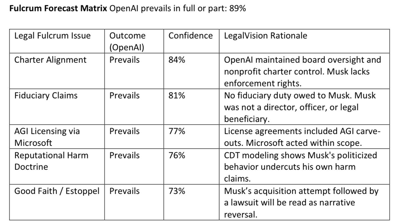 Fulcrum Forecast Matrix OpenAI prevails in full or part: 89%