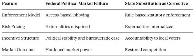 Insight: Institutional competition preserves markets. Monopoly federal enforcement invites capture; plural state enforcement disciplines it.