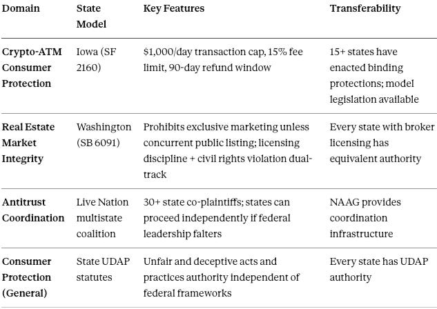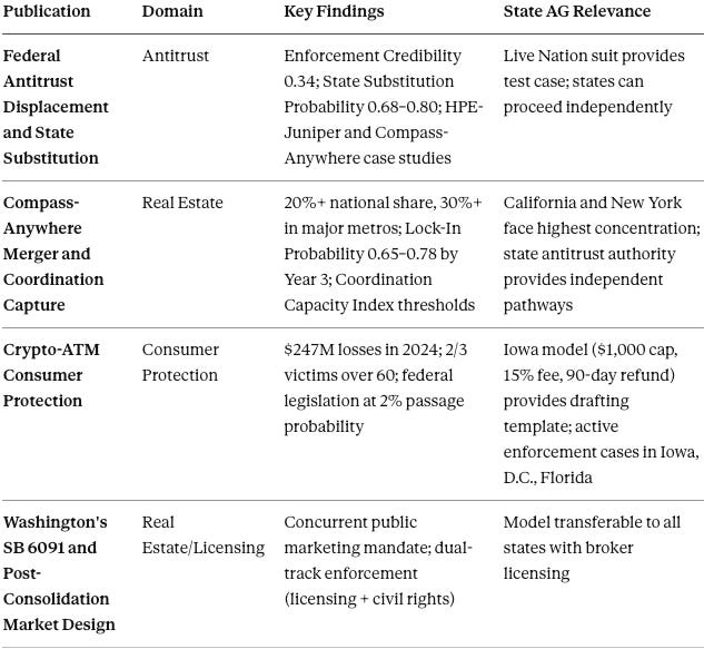 The specific examples cited in this paper—$247 million in crypto-ATM losses, 30%+ market share in major metros, HPE-Juniper settlement over staff objections, 15+ states with binding crypto-ATM protections—derive from the evidentiary records compiled in the supporting publications. Full documentation, source citations, and methodology details appear in each domain-specific publication.