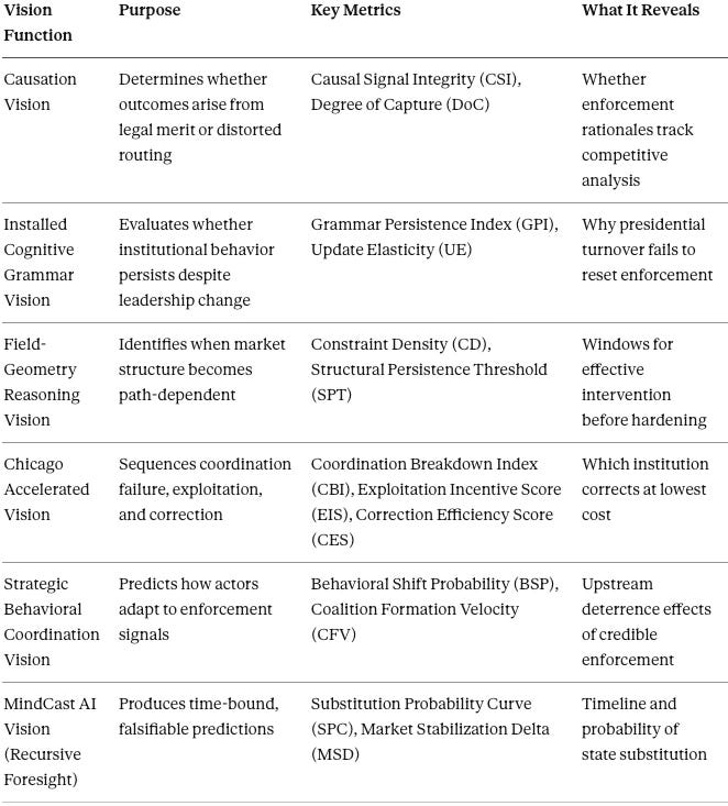 Six Vision Functions—Causation Vision, Installed Cognitive Grammar Vision, Field-Geometry Reasoning Vision, Chicago Accelerated Vision, Strategic Behavioral Coordination Vision, and MindCast AI Vision—generate quantitative metrics that propagate forward in time to produce falsifiable predictions. Key metrics include Causal Signal Integrity, or CSI (trustworthiness of enforcement rationales), Degree of Capture, or DoC (access-based distortion), Structural Persistence Threshold, or SPT (point beyond which competition cannot be restored), and Correction Efficiency Score, or CES (relative cost of institutional remedies). Full methodology and metric definitions appear in Appendix A.