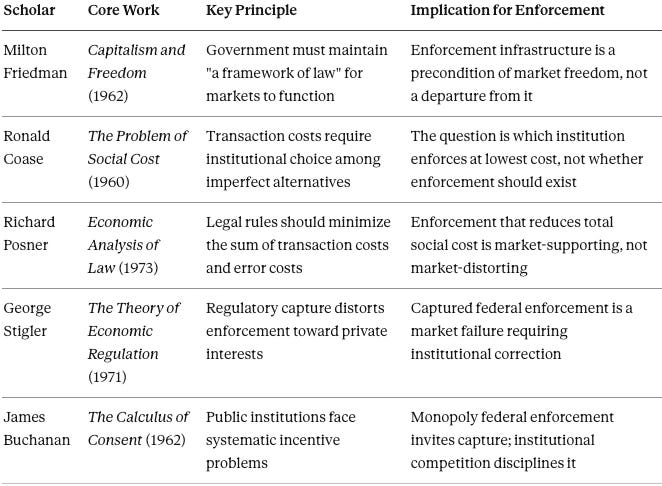 Slogan-driven commentators who denounce all enforcement as “anti-market” misunderstand the Chicago School tradition they invoke. Neither Milton Friedman nor the law-and-economics scholars who followed him argued that markets function without institutional support. Friedman’s Capitalism and Freedom (1962) explicitly identified government’s role in maintaining “a framework of law” as essential to competitive markets. The question has never been whether enforcement should exist, but rather which institutions can supply enforcement at the lowest social cost.