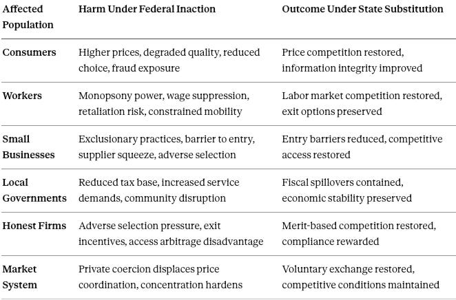 When the federal government fails to supply the public good of market integrity, markets do not self‑correct. Concentrated actors exploit discretion and delay, while consumers, workers, and local firms absorb the resulting externalities. Under these conditions, state intervention functions as a free‑market corrective rather than a departure from market principles. By acting as competing suppliers of enforcement, states restore rule‑based competition and protect local economies from harms generated by federal capture.