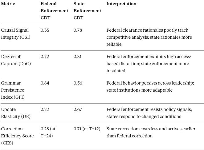 The metric spread confirms that state enforcement operates with higher causal integrity, lower capture, and greater correction efficiency than federal enforcement under current conditions.
