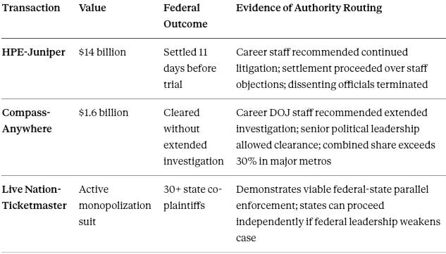 Public testimony and contemporaneous reporting demonstrate a shift from rule‑based enforcement to access‑based outcomes within federal antitrust institutions. Specific enforcement episodes illustrate how authority routing displaced legal merit, producing outcomes that staff-level analysis did not predict.