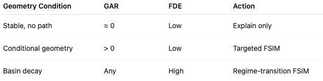 Together, these parameters gate downstream modeling by identifying geometry‑dominant regimes, distinguishing conditional curvature from inevitability, and determining whether foresight simulation is warranted. Field Decay further specifies when geometry itself is transient, signaling when foresight simulation is required to model regime transitions rather than steady drift.