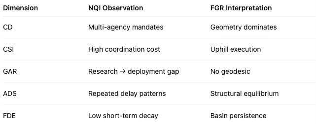 The National Quantum Initiative therefore functions as a reference case for national innovation under structural constraint. High intent and high investment coexist with predictable drift because the field lacks a downhill path that connects research, deployment, and governance. The foresight question is not whether quantum technology will advance, but whether the institutional geometry will ever allow advancement to become inertial rather than aspirational.