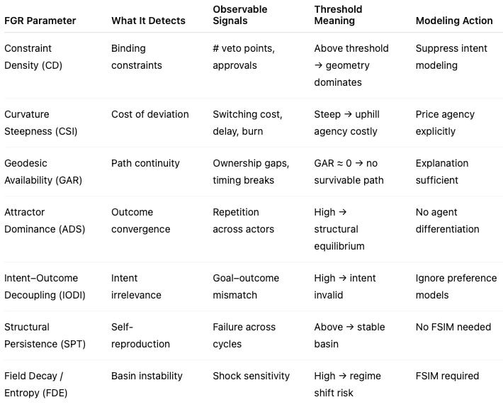Field‑Geometry Reasoning relies on diagnostic parameters rather than outcome scores. These measures determine whether behavior is geometry‑dominated, whether intent‑based modeling is valid, and whether foresight simulation adds signal or noise. To avoid rhetorical use, each parameter is calibrated against historical classes of cases and evaluated relative to threshold bands rather than absolute values.