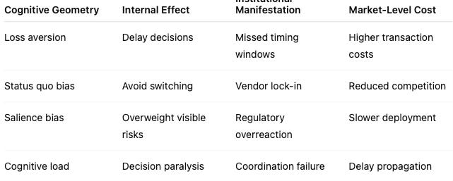 Cognitive geometry manifests institutionally when internal hesitation translates into delayed action, risk aversion, or coordination failure. A loss‑averse executive facing steep institutional curvature defers investment, which appears externally as higher transaction costs, slower bargaining, or missed timing windows. Internal geometry therefore becomes external friction through aggregation, converting psychology into market‑level drag.