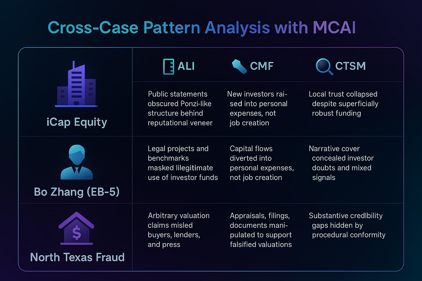 Across all three case studies—iCap Equity, Bo Zhang’s EB-5 scheme, and the North Texas appraisal fraud—a consistent pattern emerges: institutional actors were able to maintain the appearance of compliance while concealing behaviors that would later result in collapse, fraud, or litigation. These actors exploited reputational lag, regulatory gaps, and investor distance to create narrative cover. In each case, the signals tracked by MCAI—particularly Action–Language Integrity, Cognitive–Motor Fidelity, and Cognitive Trust Signal Model—diverged well before any enforcement action occurred.