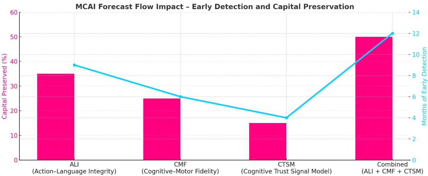 This chart visualizes how much earlier each MCAI metric can detect risk in cross-border investments—and how much capital could be preserved by acting on those insights. Action–Language Integrity (ALI), Cognitive–Motor Fidelity (CMF), and Cognitive Trust Signal Model (CTSM) each reveal distinct signal breakdowns. Their combined use offers the highest leverage in both foresight and capital preservation.