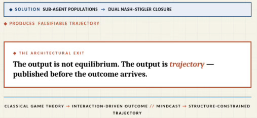 What emerges is not an improved game theory. What emerges is a different object. Classical game theory treats the game as given and asks what equilibrium emerges from interaction inside it. MindCast treats the system itself as the strategic object, models it at five layers simultaneously, and produces trajectory before interaction begins. Equilibrium is a descriptive noun pointing backward in time. Trajectory is a predictive noun pointing forward.