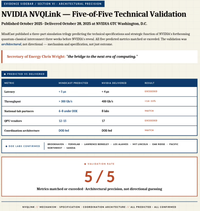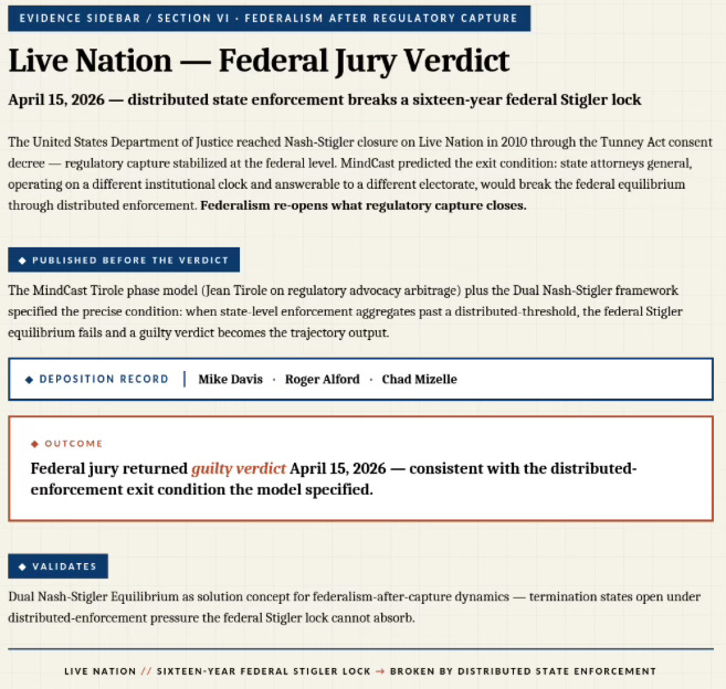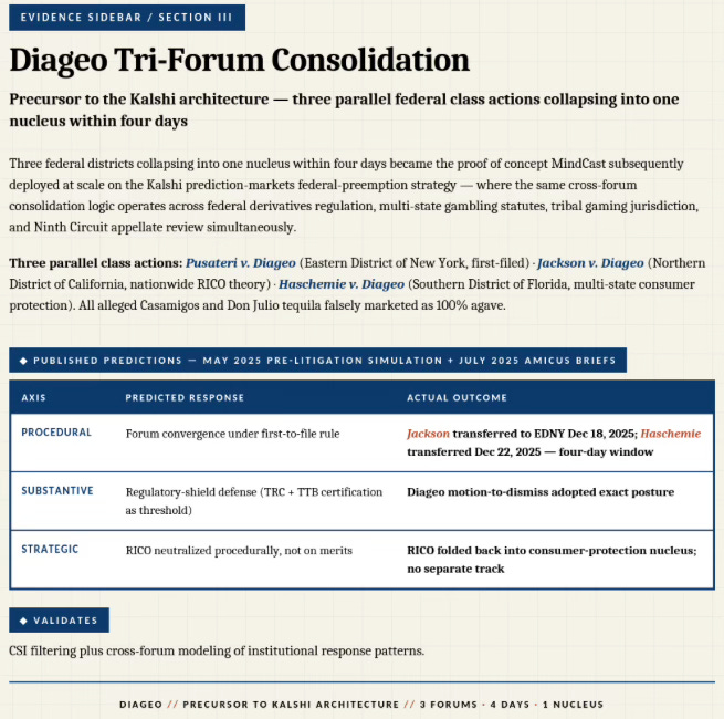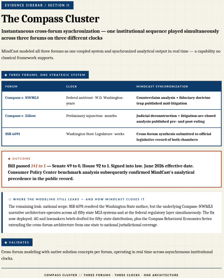 Four anchors establish the standard in this document. The Compass Cluster — Compass v. NWMLS federal antitrust, Compass v. Zillow preliminary injunction, and SSB 6091 legislative passage (141 to 1) — demonstrates instantaneous cross-forum analytical synchronization across three forums on three different clocks. The Diageo tri-forum consolidation— three federal districts collapsing into one nucleus within four days — became the cross-forum-complex-litigation precursor MindCast subsequently deployed on the Kalshi prediction-markets federal-preemption architecture. The Live Nation April 15 federal jury verdict validated the Dual Nash-Stigler solution concept under federalism-after-regulatory-capture — distributed state enforcement breaking a sixteen-year federal Stigler lock. The NVIDIA NVQLink five-of-five technical validation confirmed architectural precision, not directional guessing — mechanism and specification, matched or exceeded across all five predicted metrics. The corpus documents additional validations (Super Bowl LX, China H200, others) under the same falsification discipline.