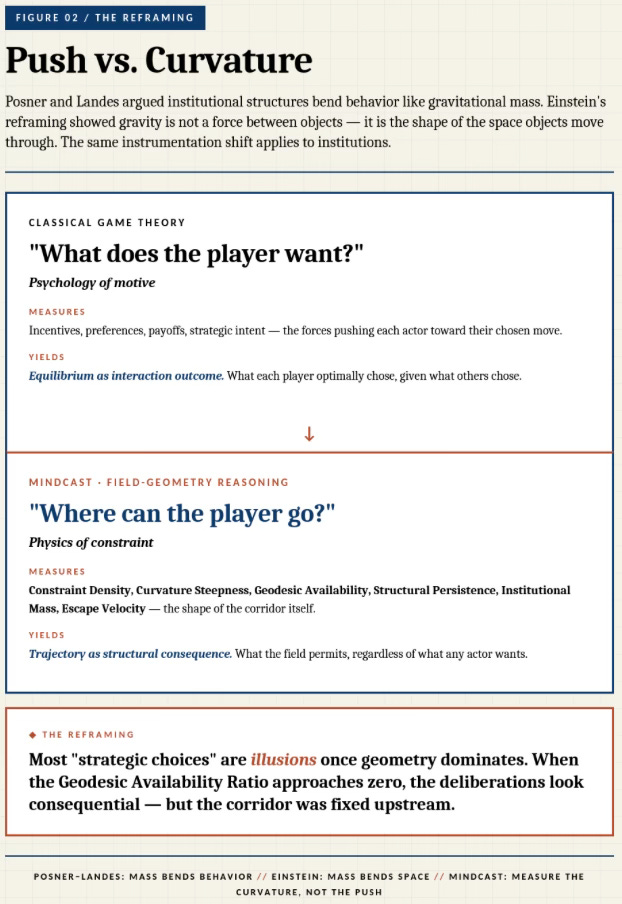 Institutional analysis for the last century measured push — the incentives, preferences, and strategic intent driving each actor toward a chosen move. Einstein’s reframing of gravity one hundred and ten years ago suggests a different instrument. Gravity is not a force between objects. Gravity is the shape of the space objects move through. Applied to institutions, the same shift reorganizes what the analyst measures. Posner and Landes saw it first — institutional structures bend behavior the way mass bends trajectory. Posner and Landes left the instrumentation unfinished. MindCast built the instrumentation. Figure 2 carries the reframing in a single diagram. Below it, the full metric architecture extends from dominance detection to field mechanics.