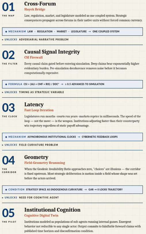 The five gaps chain. Cross-forum modeling creates the information distortion problem. CSI filtering solves the distortion and exposes latency. Latency analysis reveals geometry dominance. Geometry demands a cognitive agent to navigate it. The cognitive agent produces falsifiable forward trajectories, and the trajectories validate or disconfirm the model under a published contract. Each stage makes the next stage necessary. Remove any one and the stack does not execute.