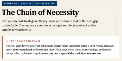 Classical game theory models strategic interaction within a fixed system. MindCast models the system itself as the strategic object. Once the system becomes the object, equilibrium is no longer the output. The output is trajectory — and trajectory replaces equilibrium the way forward-time prediction replaces backward-time explanation. The field is moving. MindCast is moving it.