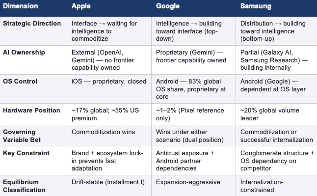Apple, Google, and Samsung are running structurally distinct bets on the same governing variable — whether artificial intelligence commoditizes or concentrates — and the outcome of that variable determines which institutional grammar wins.