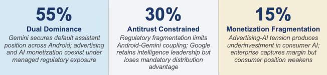 INVESTORS · Google’s Dual Dominance base case at 55% reflects a structural hedge that standard AI platform models do not capture. Under commoditization, Android distribution retains value; under concentration, Gemini retains value. The risk is not directional — it is regulatory. The Antitrust Constrained scenario at 30% is not a competitor-driven risk. It is a policy-driven risk, which means it is not priced through competitive dynamics and is therefore systematically underweighted in standard AI sector analysis.