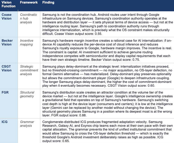 The Samsung strategic problem is not capability. Samsung has enough capability to pursue every path that matters. The problem is commitment velocity. Conglomerate-distributed grammar produces parallel initiatives that advance without threshold-crossing commitment. Google’s Android investment deliberately raises the threshold for credible defection as high as possible. Samsung’s grammar produces movement toward the threshold; Google’s grammar raises the threshold simultaneously.