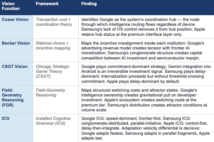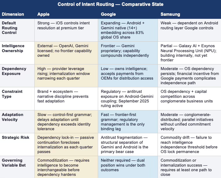 The competitive geometry is not symmetric. Google occupies the structural high ground: intelligence ownership at the frontier, OS routing control at the distribution layer, and a behavioral grammar that processes the governing variable ambiguity as an asset rather than a risk. Samsung holds the largest distribution scale in the market and is running the most structurally interesting internalization bet — but the OS constraint places Google’s infrastructure between Samsung and full routing independence. Apple controls the most valuable interface in the premium tier and is losing strategic optionality at the rate of one quarter of passive continuation at a time.