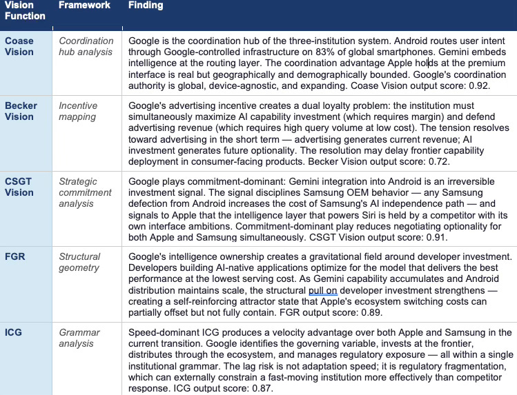 AI STRATEGY PROFESSIONALS · The Gemini-Siri relationship is the cleanest example of CDT Foresight Simulation applied to real market structure. Apple’s behavioral grammar predicts managed dependency as the second-best response when internalization is not credibly available. Google’s grammar predicts acceptance of partnership terms that deepen Apple’s dependency while Google continues building toward Apple’s interface layer. Both grammars are executing simultaneously on a single contractual relationship. The relationship is not stable — it is a temporary equilibrium that each party is attempting to use as a platform for moving to a better position.
