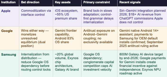 The three-institution system is not static. Each institution’s strategic choices alter the incentive environment for the others. Google’s Gemini integration into Android increases the cost of Samsung’s OS independence path. Samsung’s internalization investment increases commoditization pressure on the intelligence layer, which is the scenario Apple needs. Apple’s continued passive continuation reduces pressure on frontier providers to commoditize — a point established in Installment I and amplified by the three-institution frame.