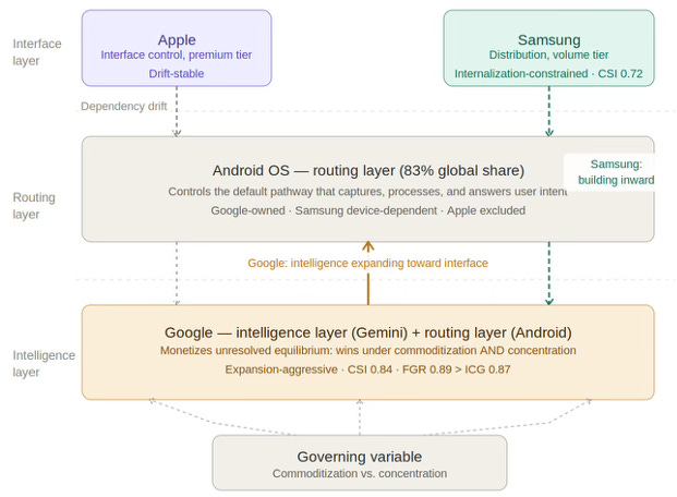 The governing variable — commoditization versus concentration — remains unresolved. Google’s dual-position strategy actively sustains the ambiguity. Samsung’s internalization path applies slow commoditization pressure through on-device AI investment. Apple waits for the variable to resolve in its favor while passive continuation deepens the dependency that makes waiting more expensive.