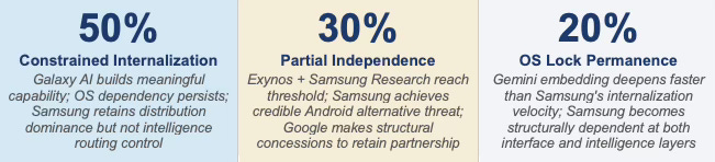 CORPORATE STRATEGY · Samsung’s Partial Independence scenario at 30% is the most underpriced strategic outcome in this analysis. Standard OEM analysis models Samsung as a Google Android partner with AI feature differentiation. The more structurally precise framing: Samsung is a distribution-scale institution with genuine chip architecture independence, a branded AI strategy, and a research organization with real capability — running a bottom-up internalization path against a competitor whose OS infrastructure sits between Samsung and full routing control. The gap between the standard framing and the structural framing is where mispricing lives.
