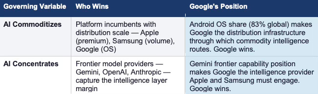 Google’s bet: the governing variable does not need to resolve in a specific direction. Google holds positions on both sides — and monetizes the ambiguity between them. Under commoditization, Android’s 83% global OS share makes Google the distribution layer through which open-weight intelligence routes. Under concentration, Gemini’s frontier capability position makes Google the intelligence provider that platform incumbents depend on.